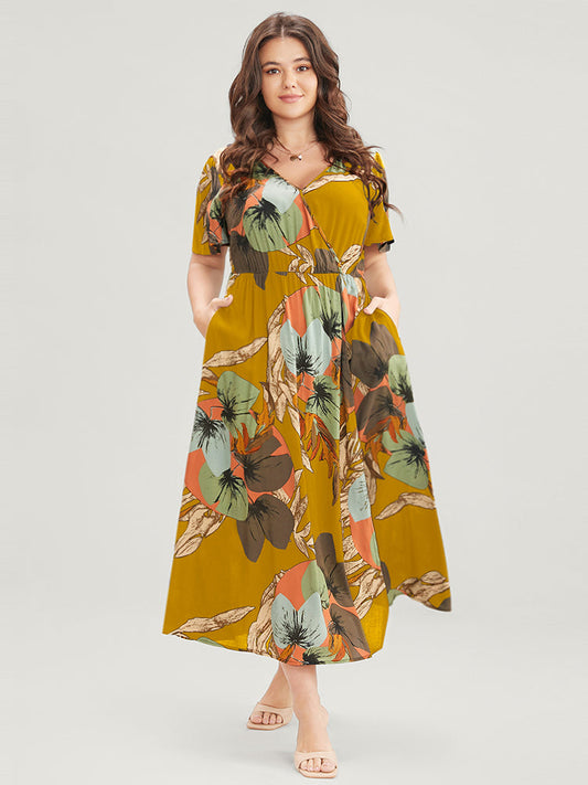 Tropical Print Pocket Ruffles Surplice Neck Midi Dress
