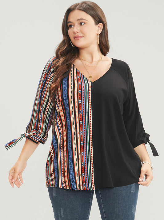 Striped Geometric Patchwork Knotted Sleeve Blouse