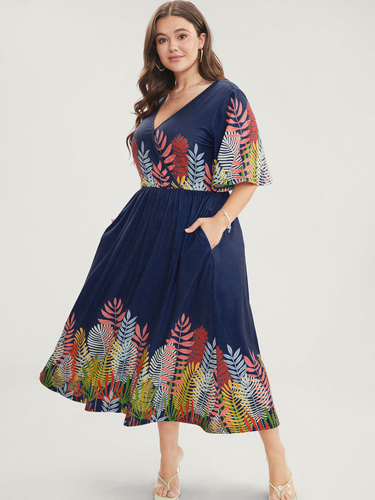 Plant Print Surplice Neck Pocket Ruffles Midi Dress