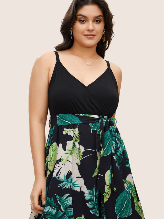 Tropical Print Pocket Wrap Belt Spaghetti Strap Flutter Dress