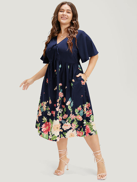 Floral Knot Pocket Flutter Sleeve Knee Dress
