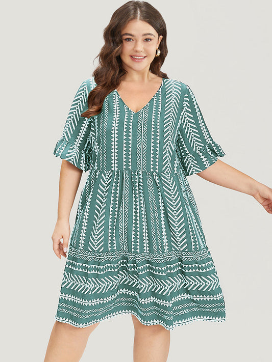 Striped Geo Patchwork Pocket Bell Sleeve Dress