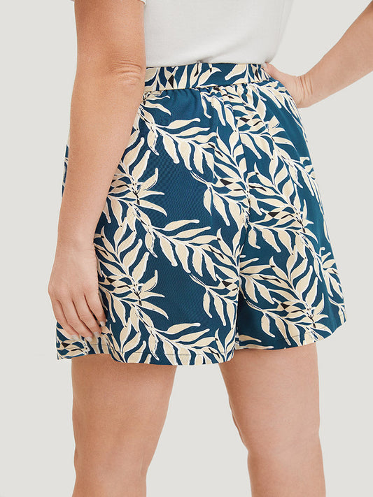 Tropical Plants Print Contrast Pocket Belted Shorts