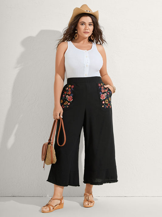 Cotton Floral Embroidered Pockets Ribbed Hem Pants