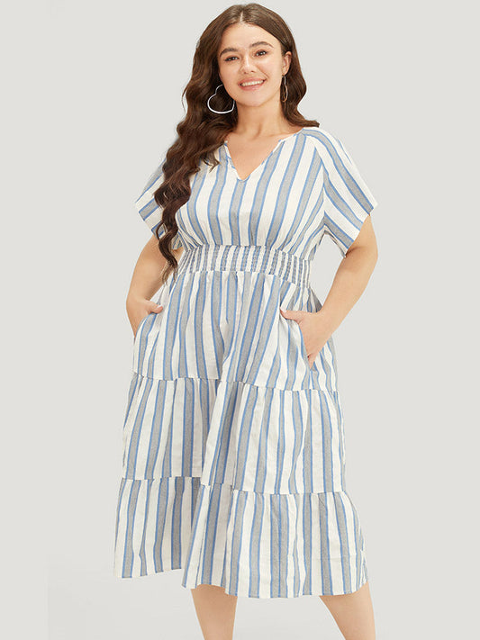 Striped Contrast Pocket Shirred Flutter Tiered Dress