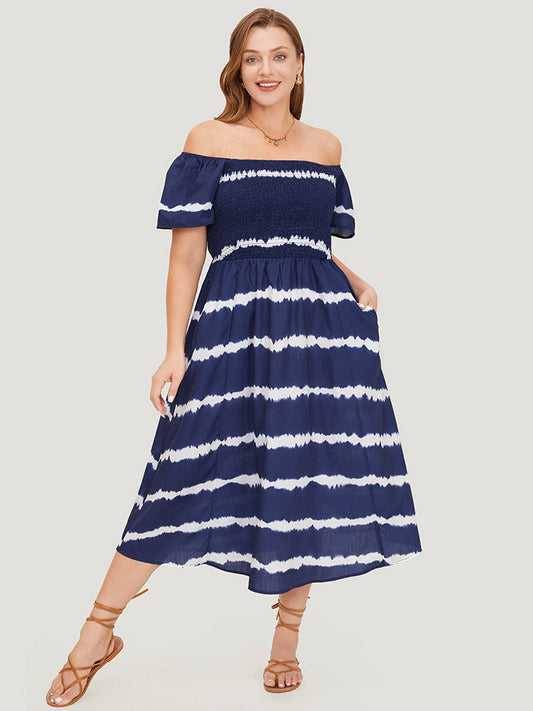 Tie Dye Ruffles Pocket Shirred Striped Off Shoulder Dress