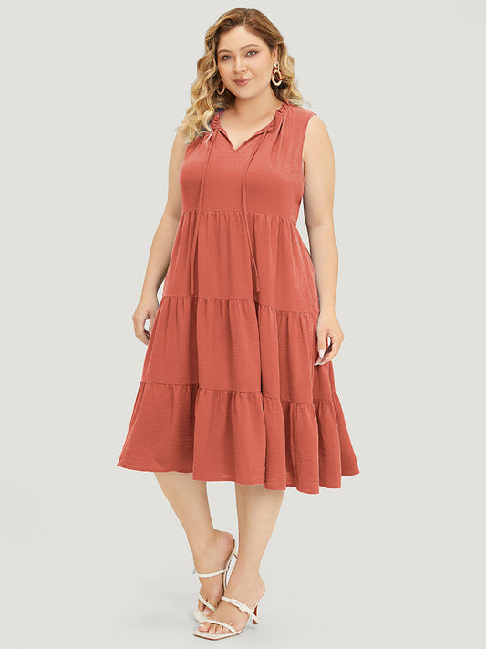 Plain Tie Neck Frill Trim Pocket Ruffle Tiered Dress