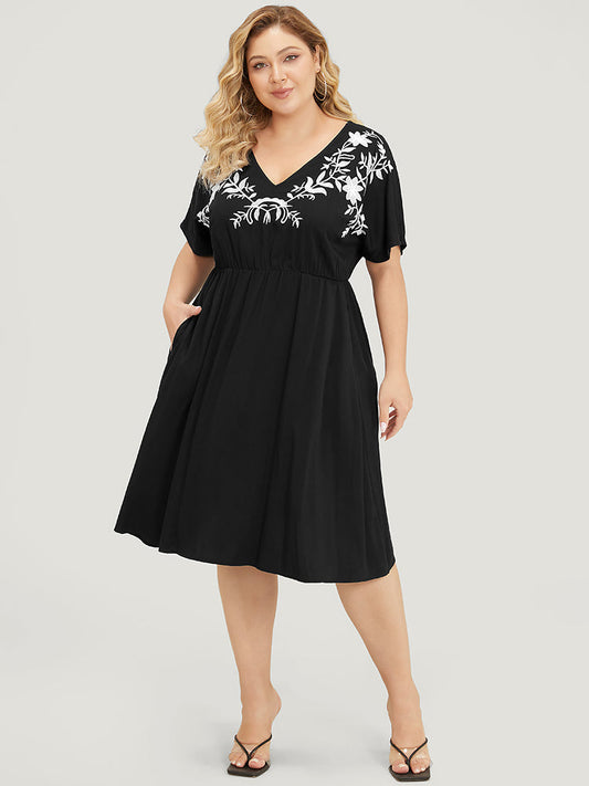 Floral Embroidered Pocket Dolman Sleeve Ruffle Dress