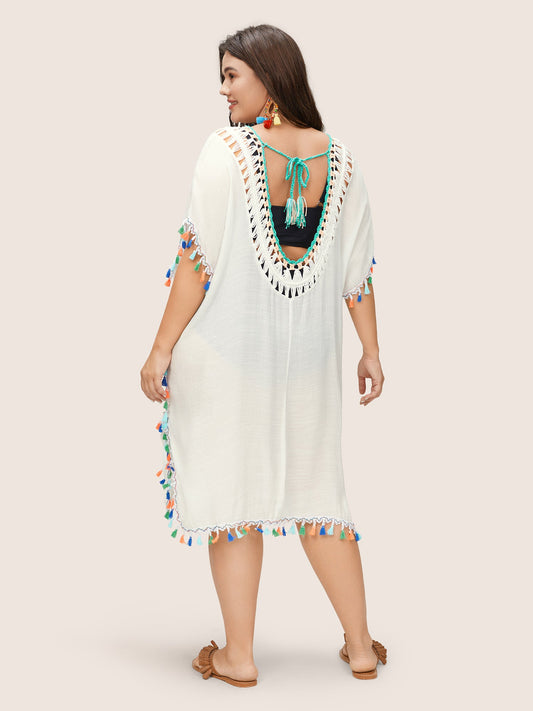 Color Tassel Trim Batwing Sleeve Swim Cover Up
