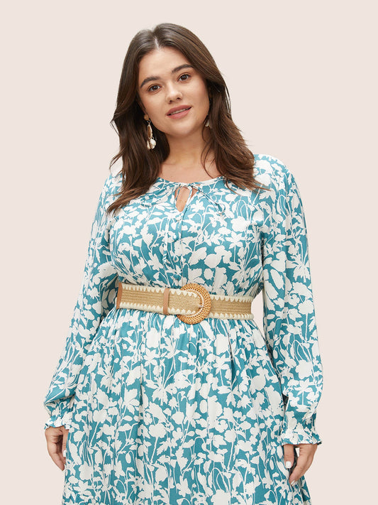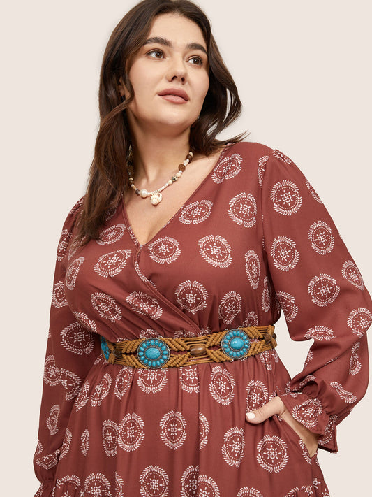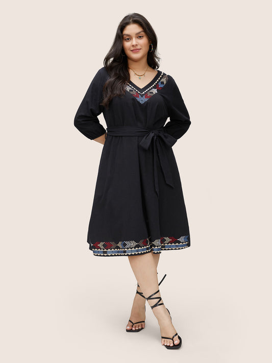 Graphic Embroidered Belted Elastic Cuffs Dress