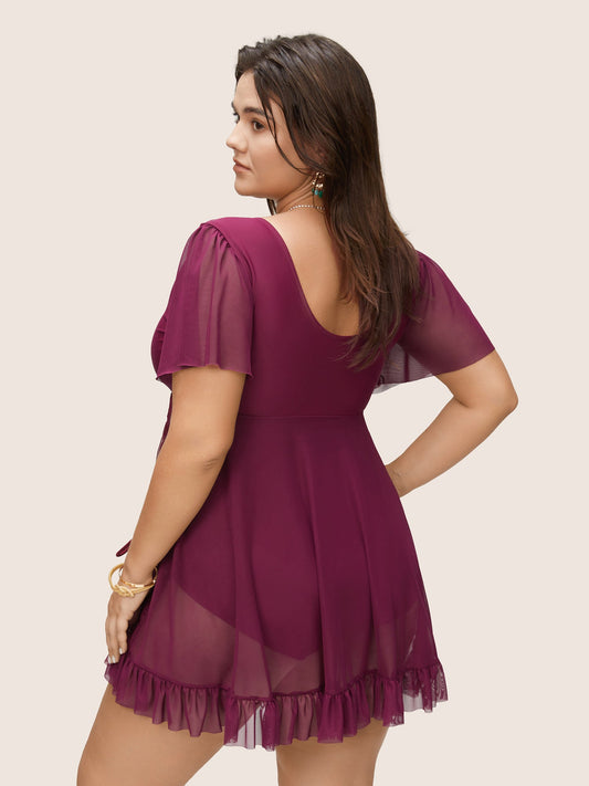 Plain Drawstring Gathered Flutter Hem Swim Dress