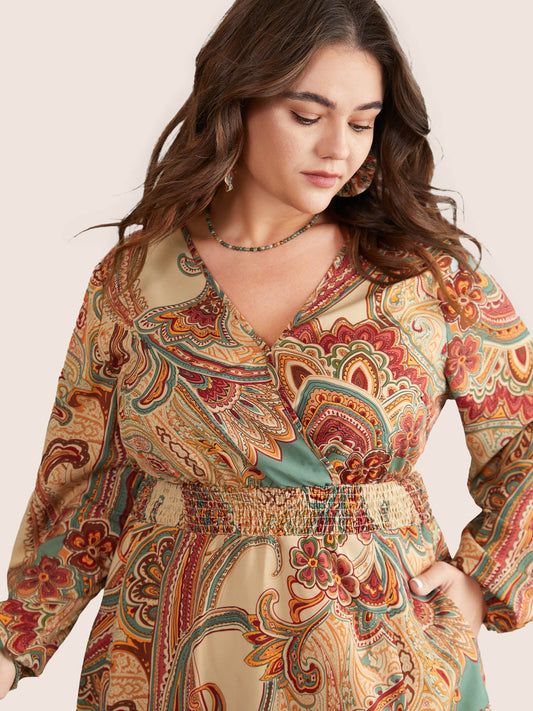 Bandana Print Tassels Ties Shirred Cuffs Dress