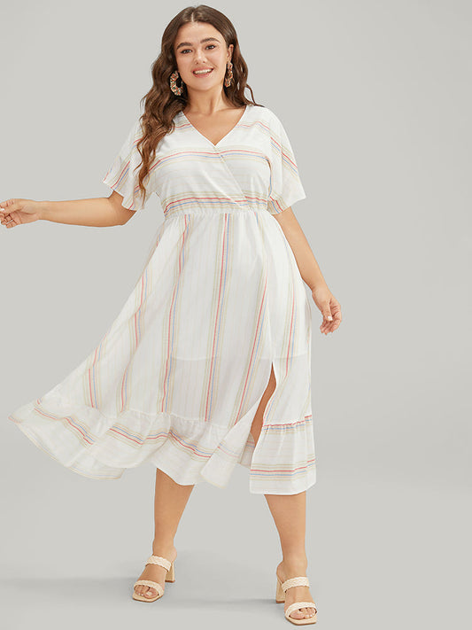 Striped Contrast Flutter Hem Dolman Sleeve Pocket Split Wrap Dress