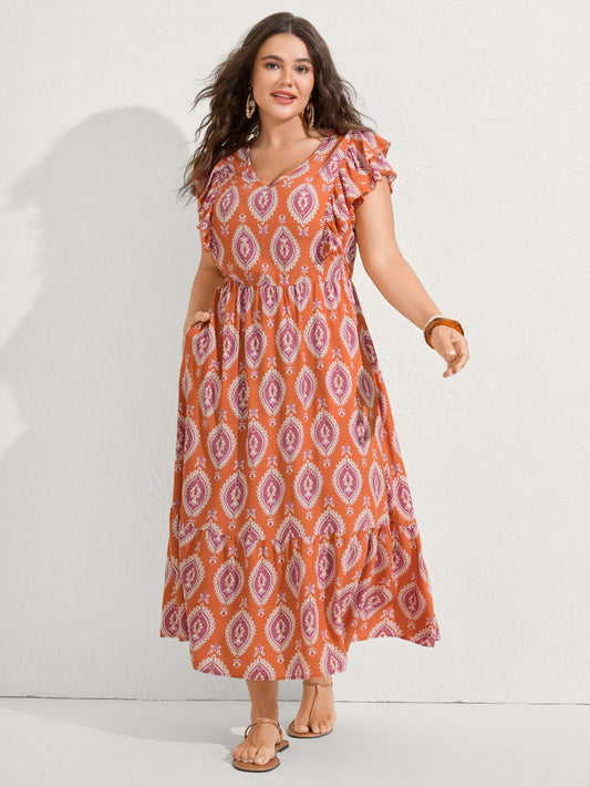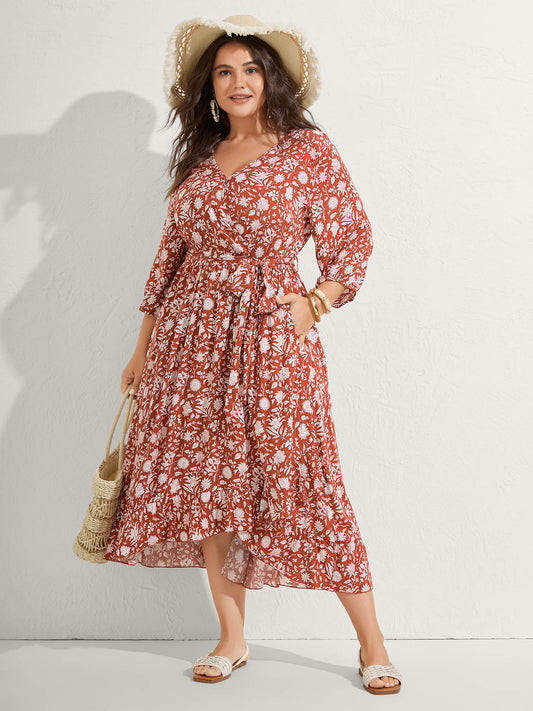 Rayon Silhouette Flower Side-Tie Midi Dress