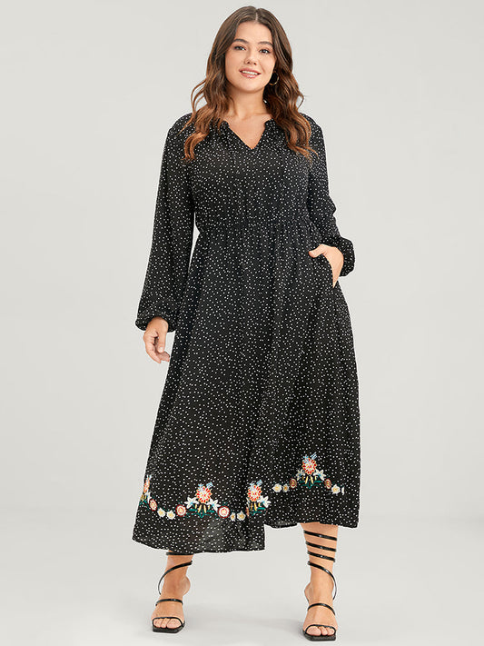 Polka Dot Lantern Sleeve Pocket Embroidered Detail Dress