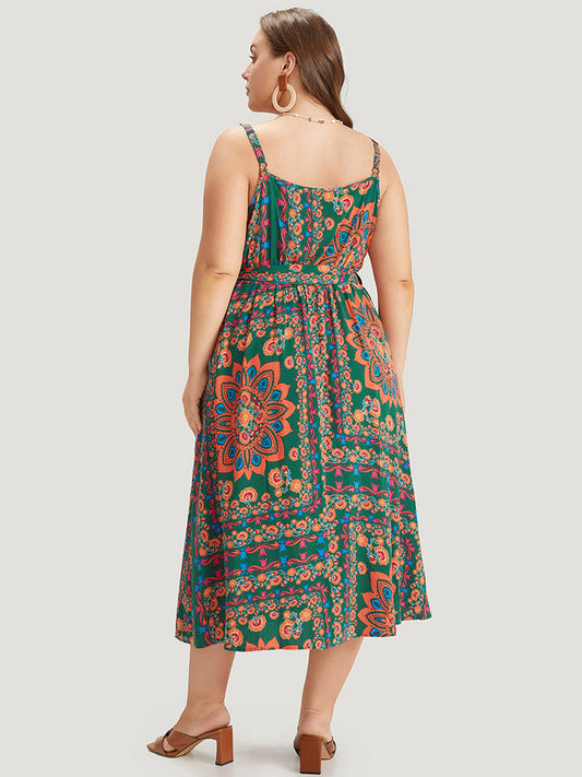 Boho Print Belted Split Hem Pocket Cami Dress