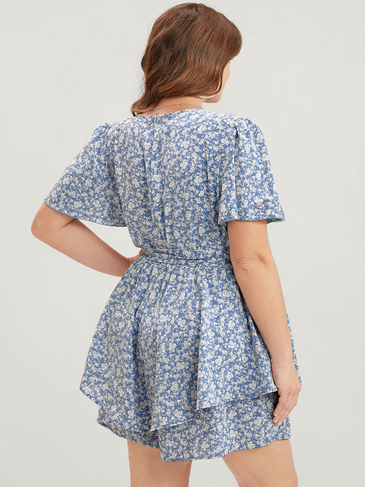 Ditsy Floral Wrap Pocket Belted Ruffles Romper
