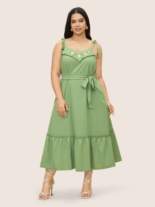 Floral Embroidered Tassel Pleated Frill Trim Dress