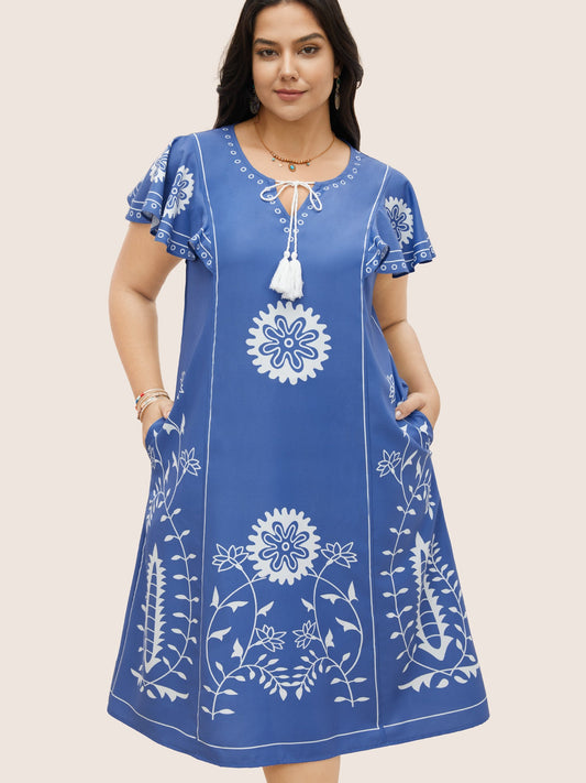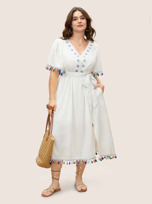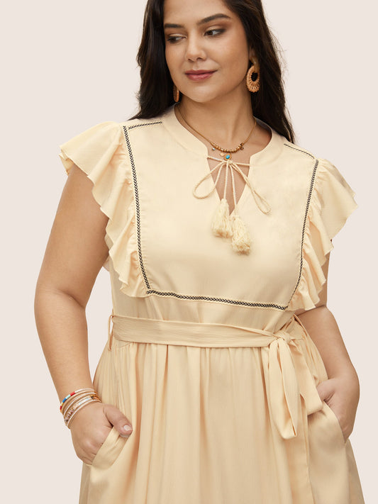 Notch Ruffle Cap Sleeve Woven Ribbon Tassels Dress