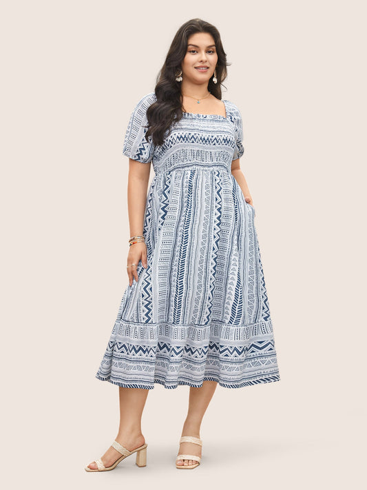 Geometric Shirred Pocket Lantern Sleeve Dress