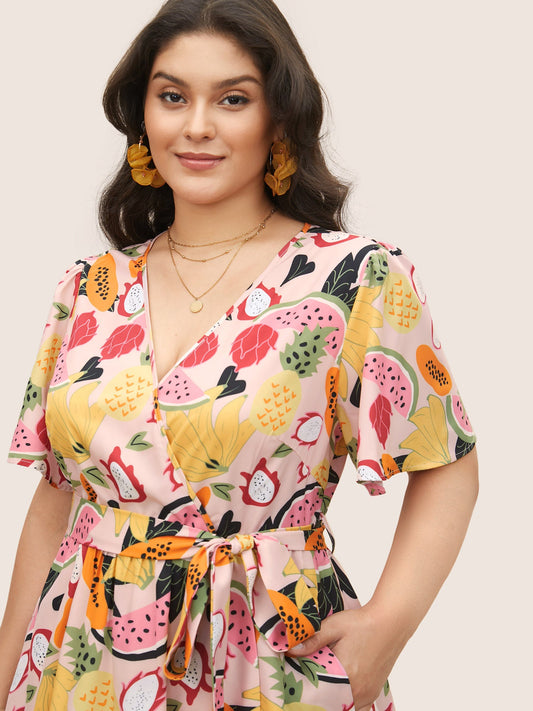 Fruit Print Overlap Collar Belted Pocket Dress
