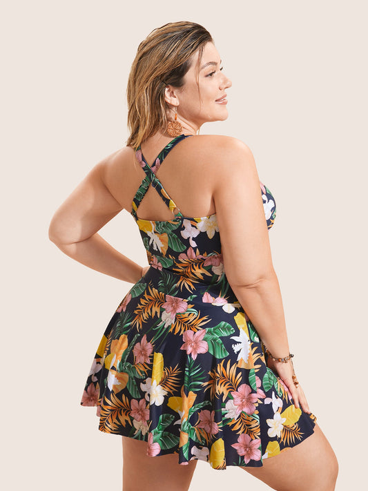 Tropical Adjustable Straps Ruched Swim Dress