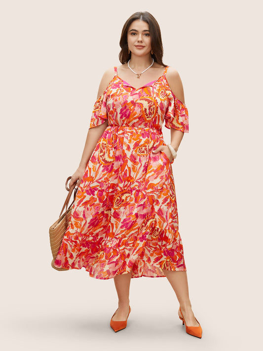 Floral Tie Knot Cold Shoulder Pocket Dress