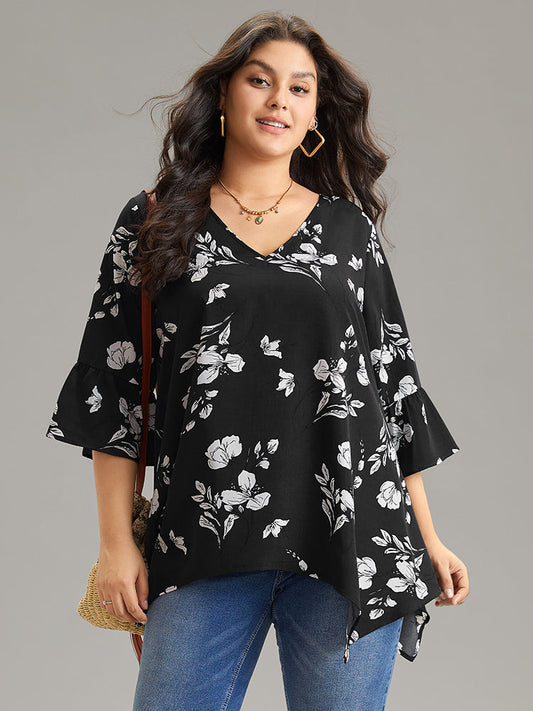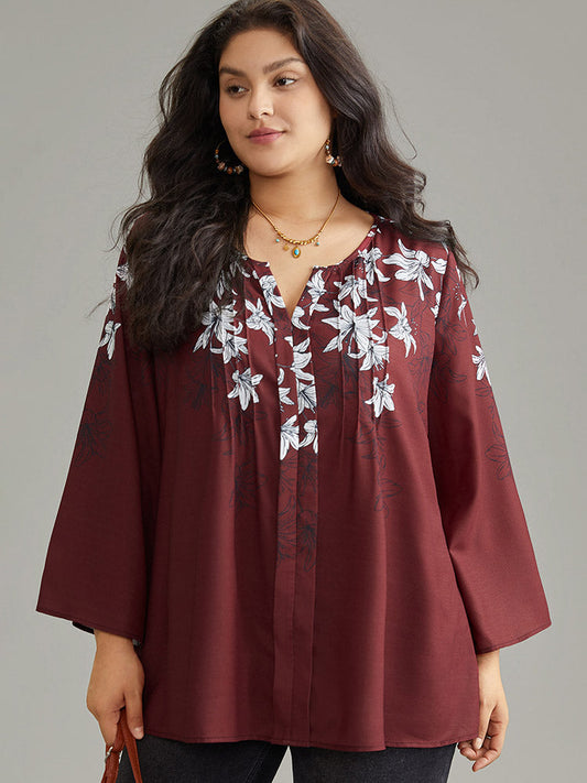 Boho Print Ruffle Sleeve Notched Pleated Blouse
