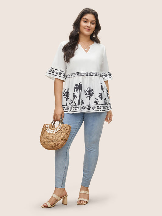 Feather Print Notched Tiered Ruffle Hem Blouse
