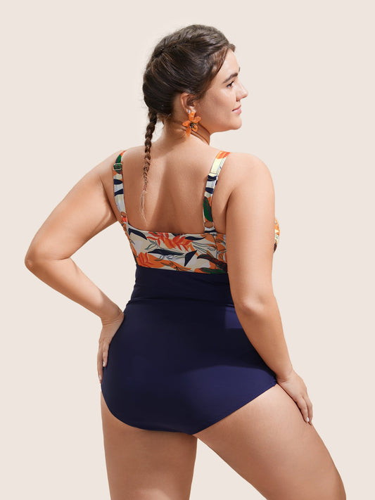 Tropical Patchwork Flutter Trim One Piece Swimsuit