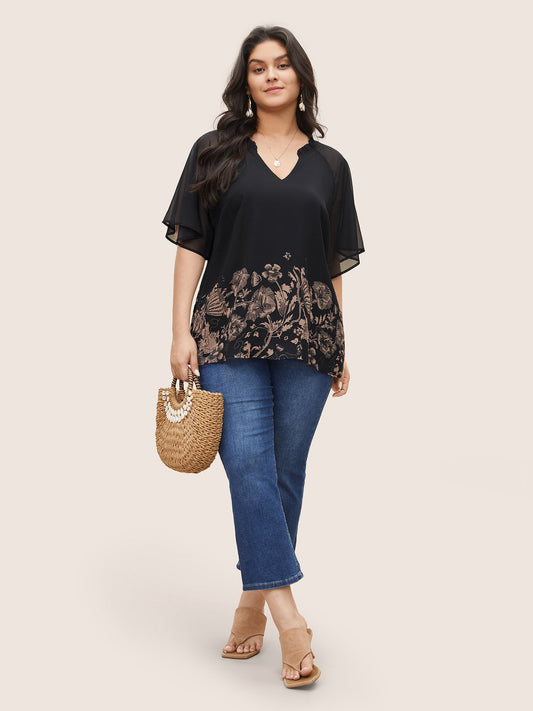 Boho Print Patchwork Mesh Frill Trim Blouse
