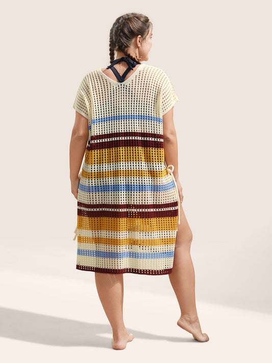 Contrast Hollow Out Ties Batwing Sleeve Swim Cover Up