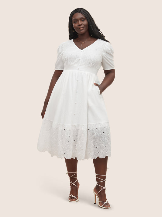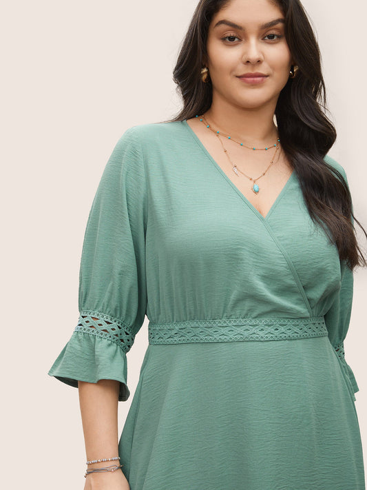 Solid Eyelet Lace Surplice Neck Ruffle Sleeve Dress