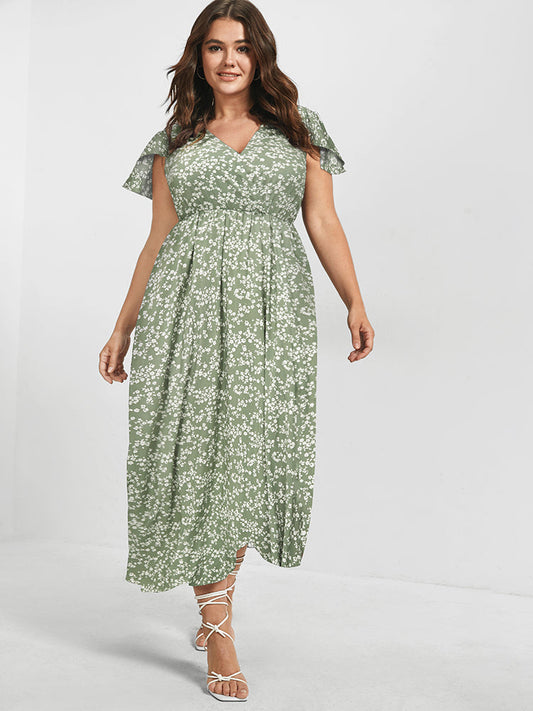 Floral V Neck Flutter Sleeve Split Maxi Dress
