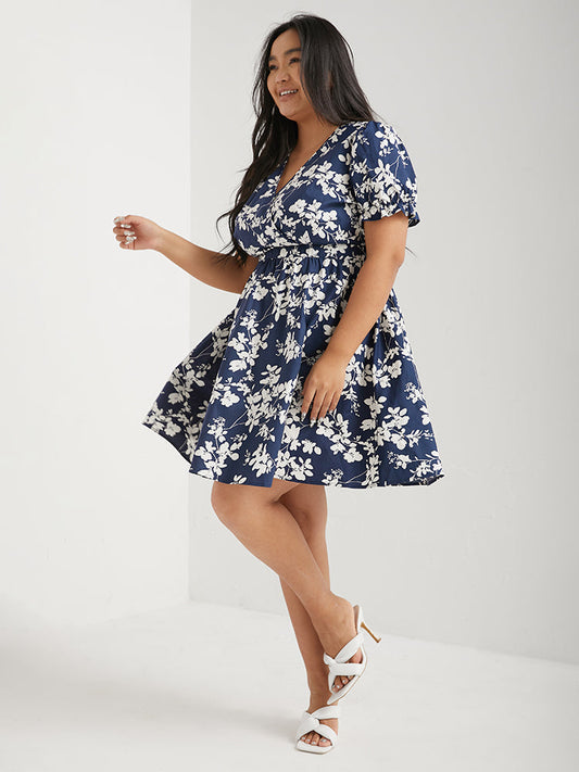 Floral Print Puff Sleeve Elastic Waist Short Dress