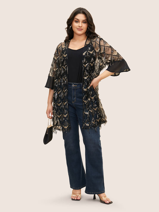 Sequin Mesh Patchwork Tassel Trim Cover Up