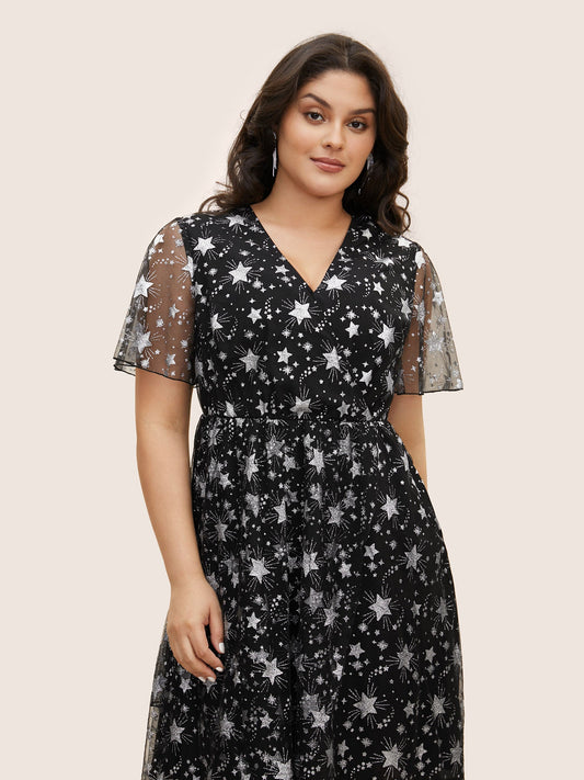 Glitter Star Mesh Patchwork Ruffle Sleeve Dress
