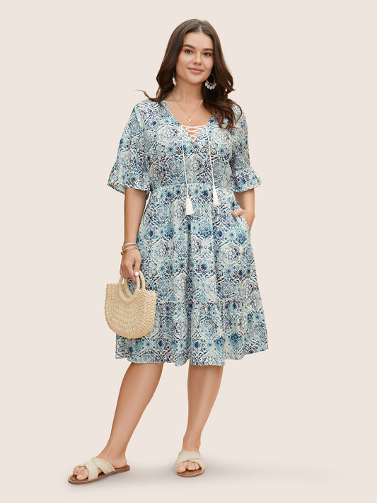 Boho Print Tassels Trim Flutter Sleeve Dress