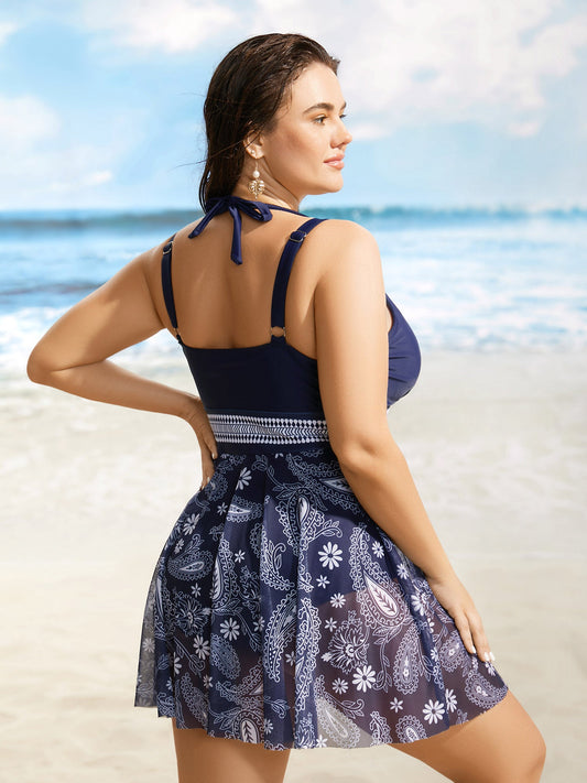 Overlap Collar Tropical Print Gathered One Piece Swimsuit