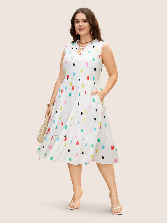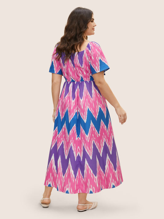 Geometric Contrast Shirred Flutter Sleeve Dress