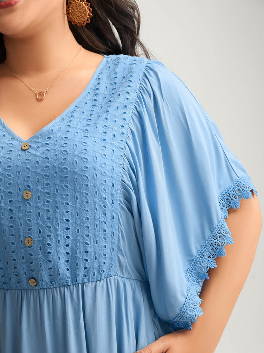 Eyelet Trim Stretchy Flowy Sleeve Midi Dress