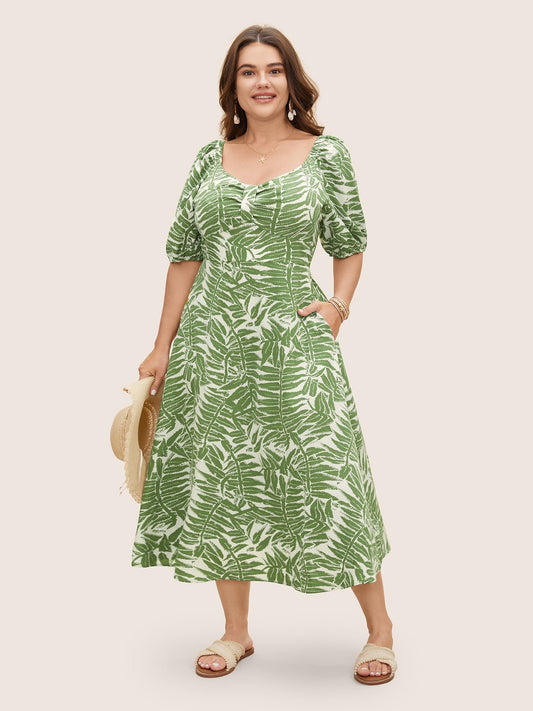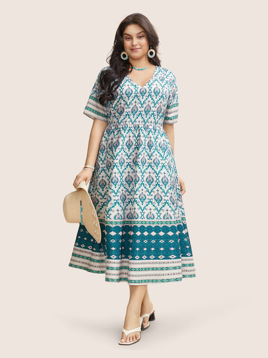 V Neck Boho Print Ruffle Sleeve Midi Dress