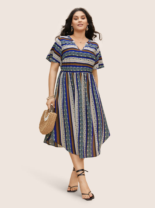 Bandana Striped Curved Hem Ruffle Sleeve Dress