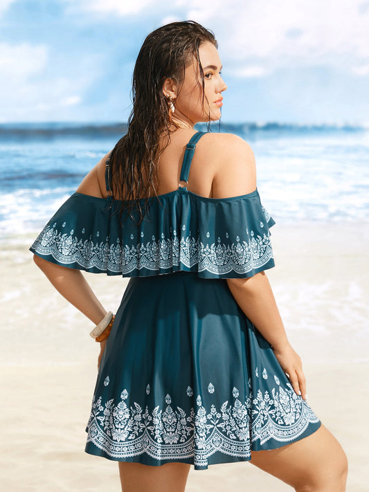Boho Print Off Shoulder Ruffle Trim Swim Dress