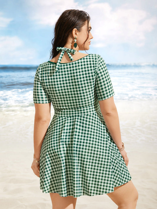 Gingham Patchwork Drawstring Tie Knot Swim Dress