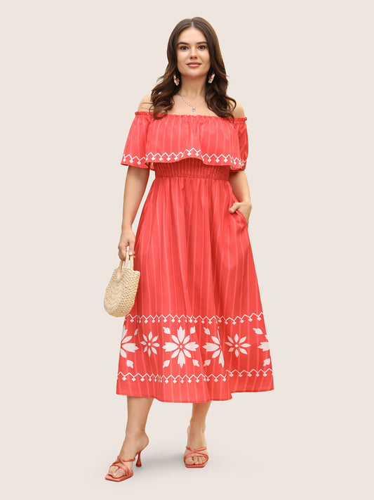 Striped Boho Print Off Shoulder Ruffle Trim Dress