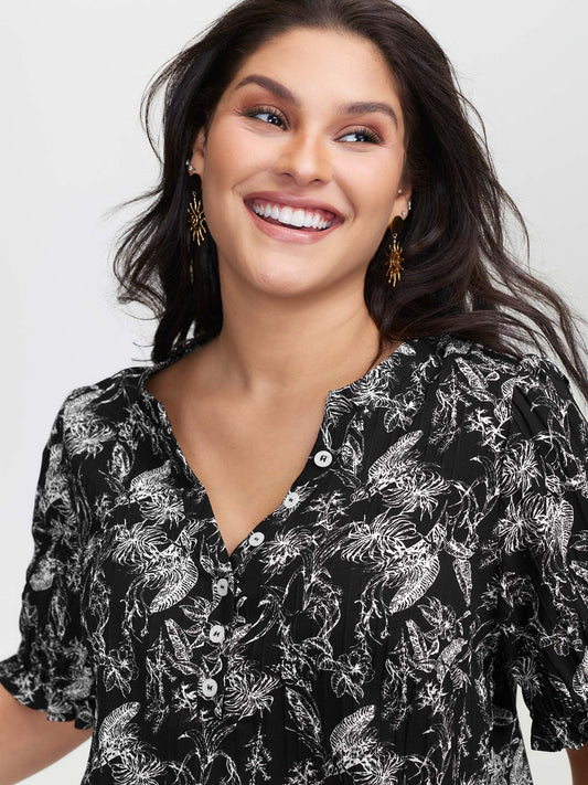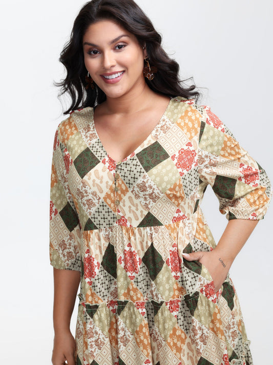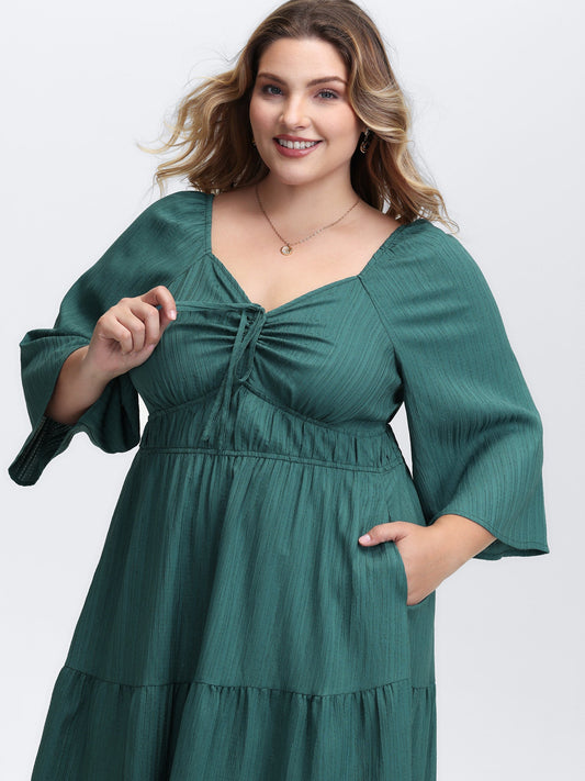 Textured Chest Drawstring Three Quarter Sleeve Midi Dress