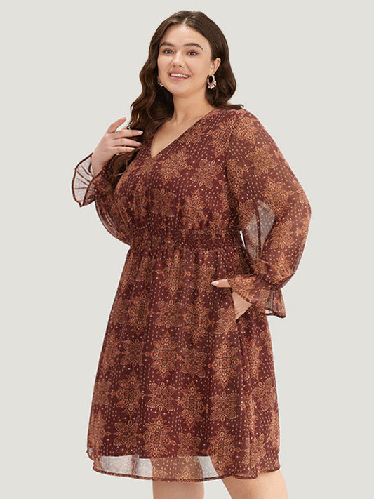 Floral Embroidered Pocket Square Neck Lantern Sleeve Dress