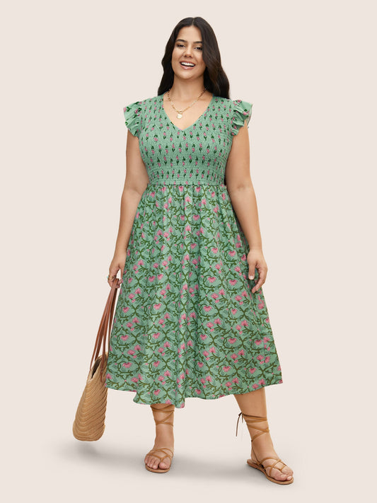 Boho Print Shirred Ruffle Cap sleeve Dress