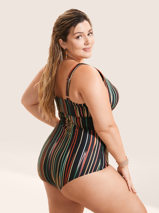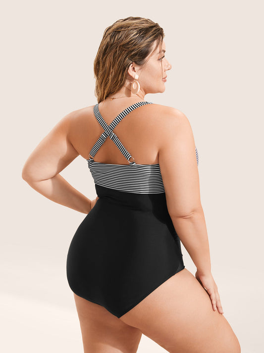 U Neck Stripes Patchwork Buckle Detail One Piece Swimsuit